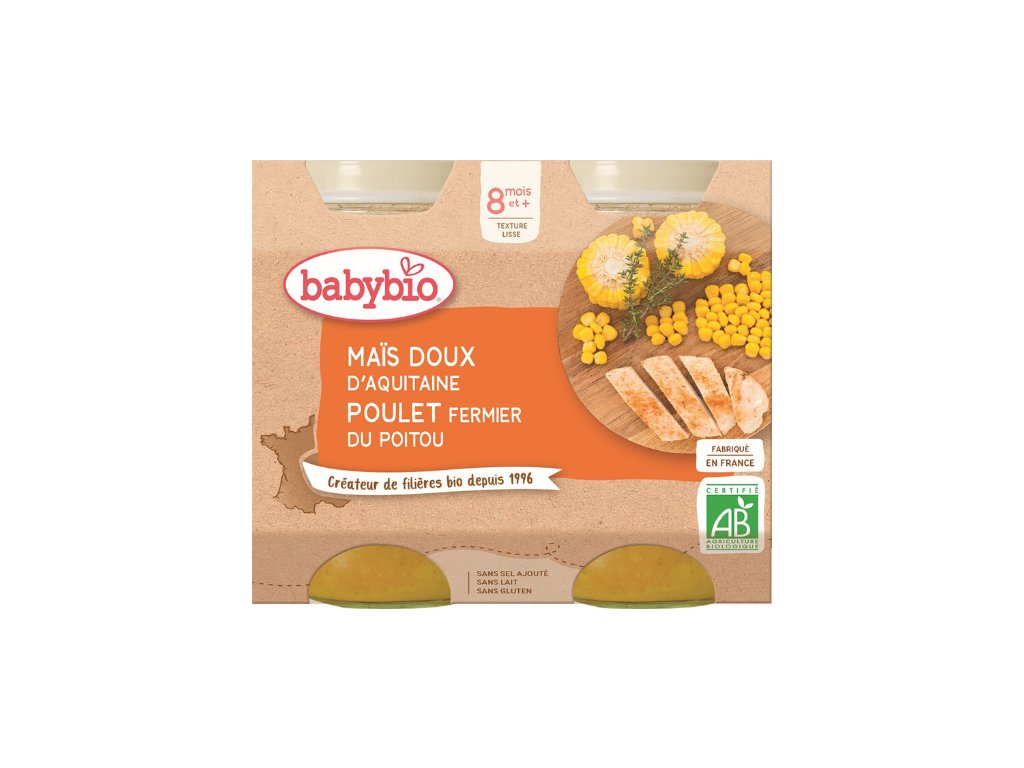 "Bio výživa pre dojčatá od ukončeného 8. mesiaca. Naše farmárske kuriatko doplnené francúzskou kukuricou, sladkou mrkvou a zemiakmi poteší všetky chuťové poháriky. Naozajstná pochúťka pre malých gurmánov!Výrobok ekologického poľnohospodárstva. Určené na zvláštnu výživu dojčiat a malých detí. Bez pridaného cukru. Bez palmového oleja. Bez pridanej soli. Bez chemických konzervačných látok, dochucovadiel, zahusťovadiel a farbív. Garancia Babybio: Ekologická výživa pre dojčatá. 25 rokov odborných skúseností. Známy pôvod surovín. Receptúry vyvíjané v spolupráci s francúzskymi pediatrami a nutričnými odborníkmi. Vyrobené vo Francúzsku. Balené v ochrannej atmosfére. Obaly neobsahujú BPA. Každá novo vyrobená výrobná šarža podlieha laboratórnemu rozboru priamo u výrobcu, než je uvoľnená do predaja."