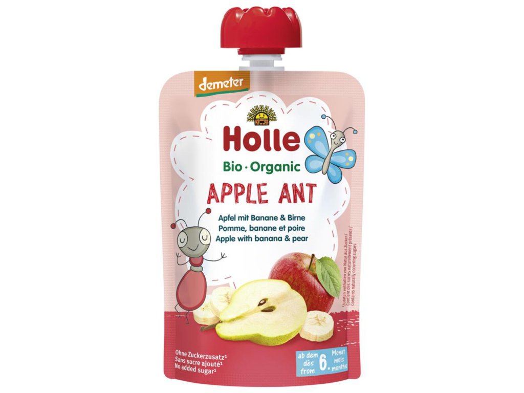 APPLE ANT – JABLKO, BANÁN A HRUŠKA – bio ovocné pyré, vhodné od ukončeného 6. mesiaca veku, Certifikácia DEMETER – starostlivo vybrané a prísne kontrolované suroviny pochádzajúceho z biodynamického poľnohospodárstva.- S jablkom, banánom a hruškou, nič iné!
