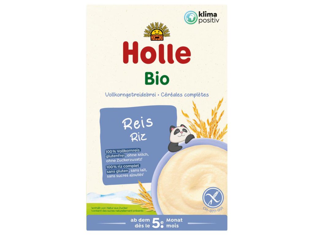 HOLLE DETSKÁ bio celozrnná obilná ryžová kaša od ukončeného 4. - 6. mesiaca. Pripravuje sa zmiešaním s mliekom. HOLLE DETSKÁ celozrnná obilná ryžová kaša instantný následný výživový prípravok na báze obilia v prášku pre dojčatá a malé deti od ukončeného 4. - 6. mesiaca.Krajina pôvodu hlavných zložiek: Taliansko