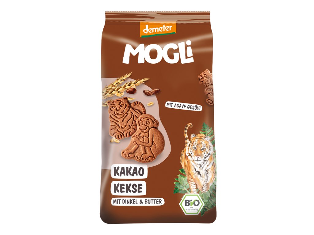 KAKAOVÉ KEKSE. MOGLI udržateľná značka, ktorá vyrába tie najlepšie dobroty pre malých objaviteľov sveta pod certifikáciou DEMETER.Zloženie: Špaldová múka* 29 %, pšeničná múka* , agávový sirup** 15 %, maslo* 13 %, agávový sirup v prášku** 11 %, kakao** 3 % *z biodynamického pestovania, **z ekologického pestovania